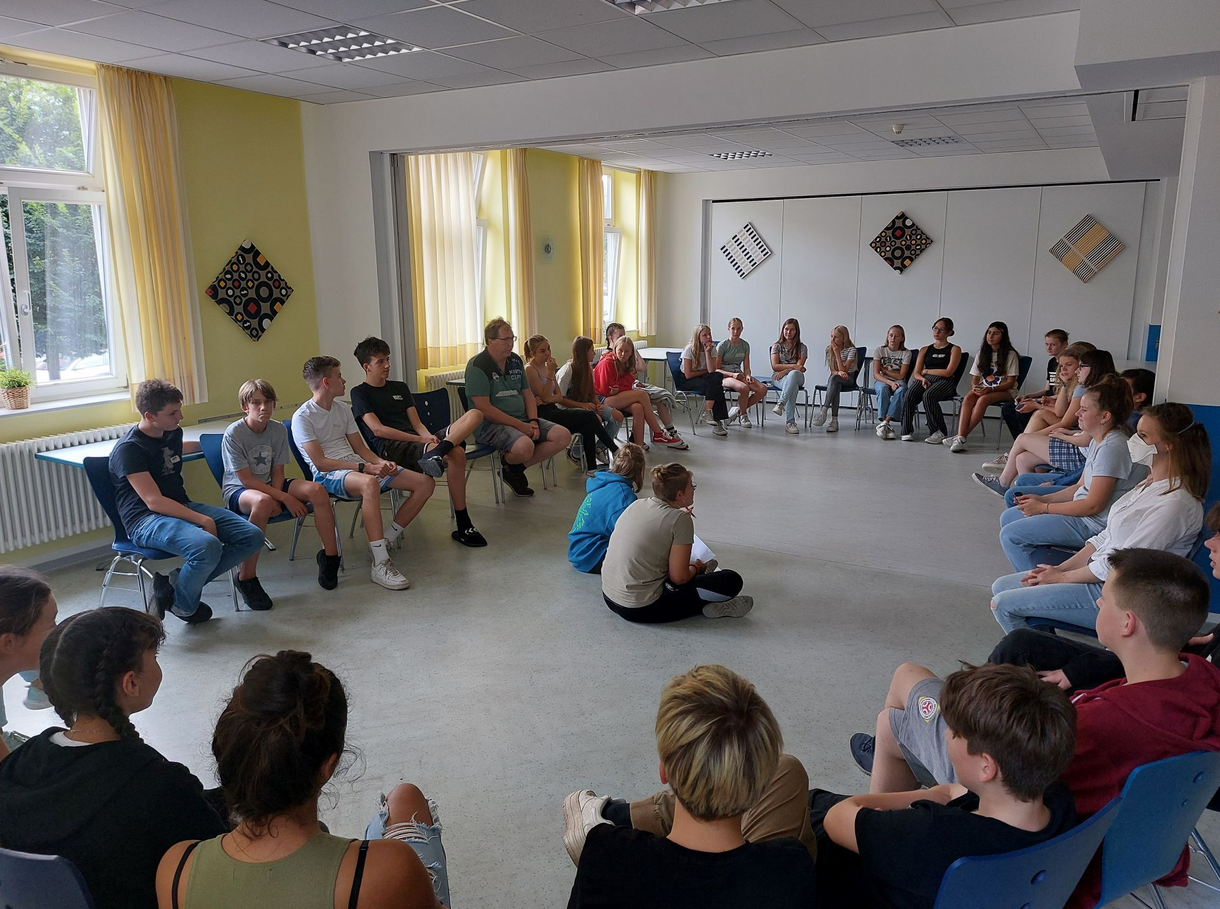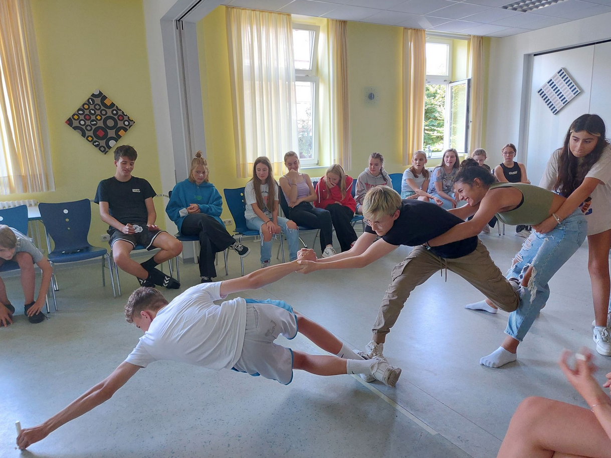Frisch gestärkt begannen wir dann mit der Streitschlichterausbildung. Zuerst gab es einige Spiele, damit sich die Teams unserer beiden Schulen besser kennenlernen konnten und bei denen sich schnell neue Freundschaften bildeten. Wir beschäftigten uns zunächst mit den Aufgaben der Prefects. Nachdem uns dann die vier Phasen der Streitschlichtung vorgestellt wurden, probten wir das Ganze in Rollenspielen. Dabei kam es zu sehr lustigen Szenen und wir haben viel gelacht.